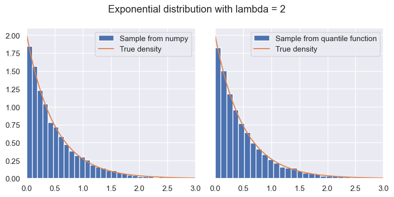 sample_quantileobtenu par transformation par \(F_\lambda^{-1}\) d’un échantillon \((U_1, \dots, U_n)\) i.i.d. avec \(U_i \sim \mathcal{U}([0, 1[)\).