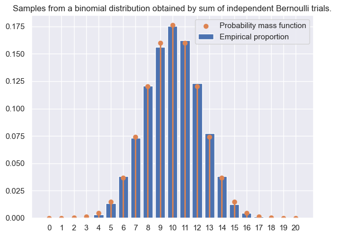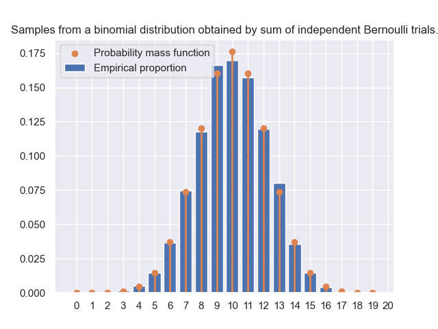 ax.set_title('Samples from a binomial distribution obtained by sum of independent Bernoulli trials.')