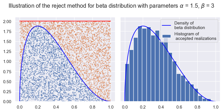 On propose d’illustrer la méthode du rejet dans le cas d’une loi bêta de paramètres \(\alpha > 1\) et \(\beta > 1\). On rappelle la forme de la densité de la loi