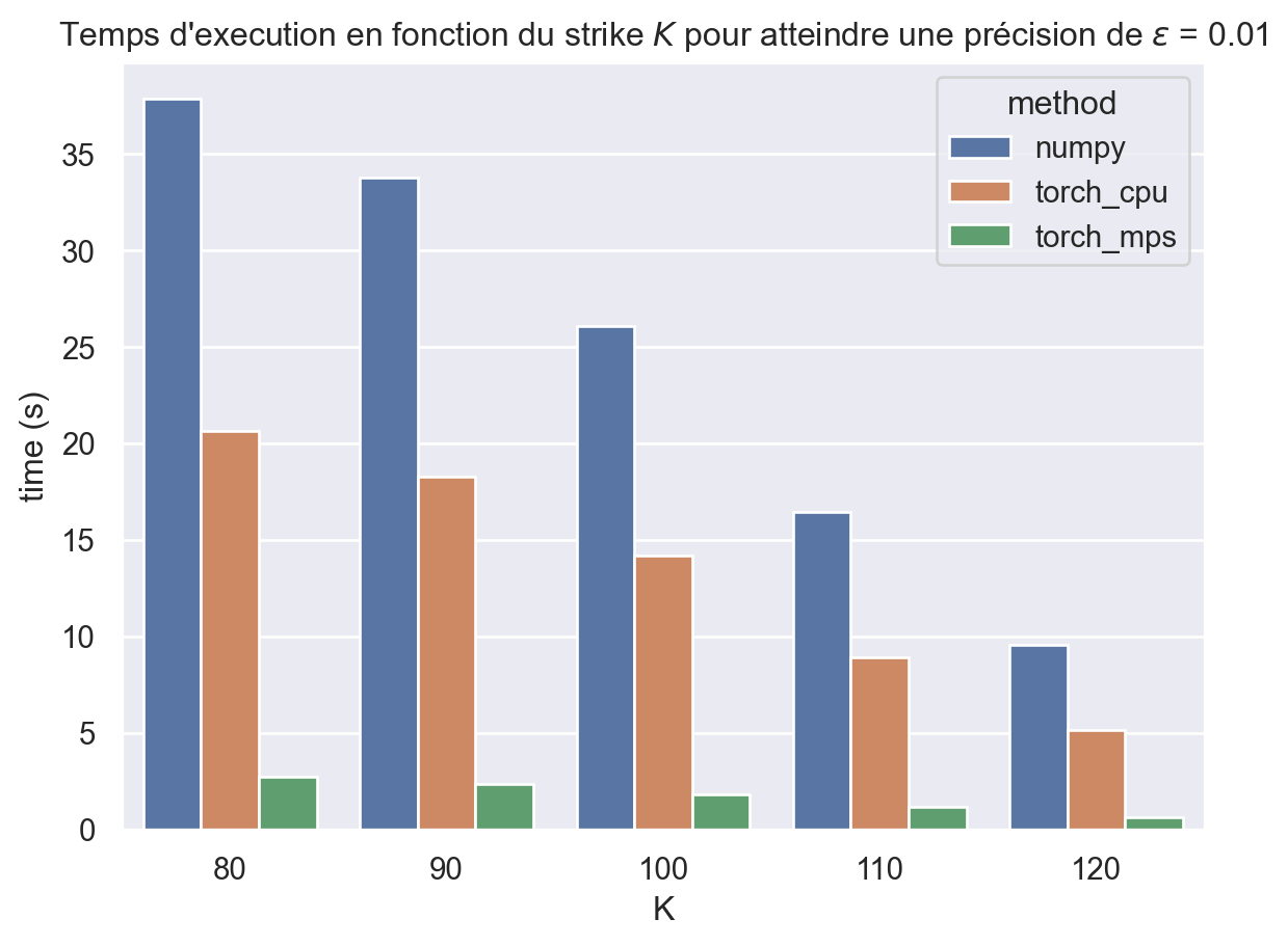 result = pd.concat([ result_numpy, result_torch_cpu, result_torch_mps ])ax = sns.barplot(data=result, x="K", y="time (s)", hue="method")ax.set_title(fr"Temps d'execution en fonction du strike $K$ pour "+fr"atteindre une précision de $\epsilon$ = {epsilon}");