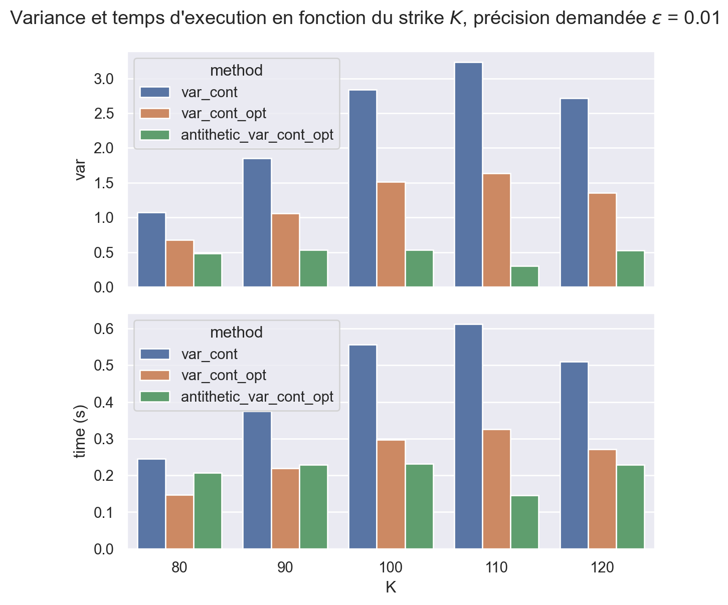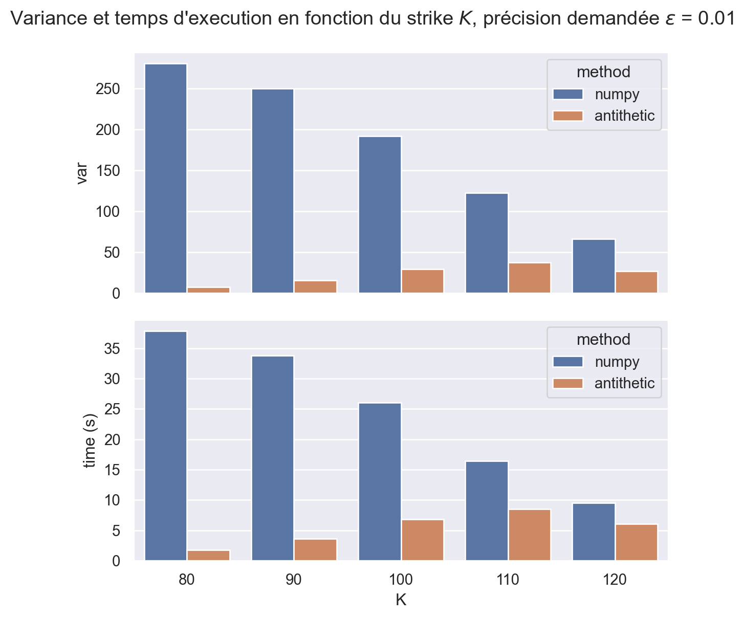 result = pd.concat([ result_numpy, result_antithetic ])fig, (ax1, ax2) = plt.subplots(nrows=2, ncols=1, figsize=(6.4,6.4), sharex=True, layout="tight")sns.barplot(data=result, x="K", y="var", hue="method", ax=ax1)sns.barplot(data=result, x="K", y="time (s)", hue="method", ax=ax2)fig.suptitle(fr"Variance et temps d'execution en fonction du strike $K$, "+fr"précision demandée $\epsilon$ = {epsilon}");