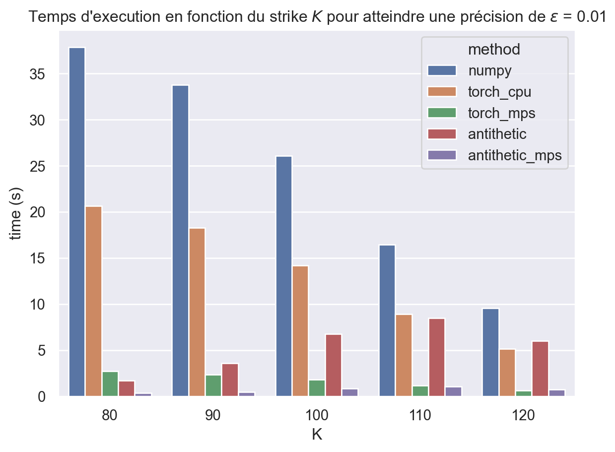 result = pd.concat([ result_numpy, result_torch_cpu, result_torch_mps, result_antithetic, result_antithetic_mps ])ax = sns.barplot(data=result, x="K", y="time (s)", hue="method")ax.set_title(fr"Temps d'execution en fonction du strike $K$ pour "+fr"atteindre une précision de $\epsilon$ = {epsilon}");
