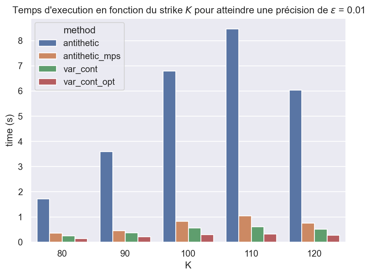 result = pd.concat([ result_antithetic, result_antithetic_mps, result_varcont, result_varcont_opt ])ax = sns.barplot(data=result, x="K", y="time (s)", hue="method")ax.set_title(fr"Temps d'execution en fonction du strike $K$ pour "+fr"atteindre une précision de $\epsilon$ = {epsilon}");