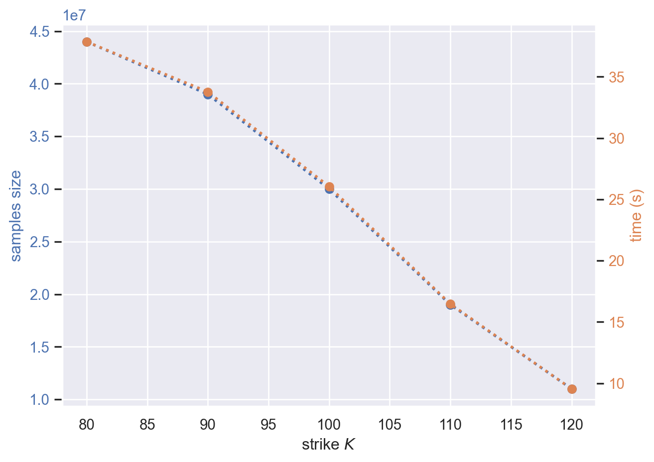 def run(name, function, epsilon, batch_size, **kwargs): filename ="02_data/"+ name +".pkl"if os.path.exists(filename): withopen(filename, "rb") asfile: result_df = pickle.load(file)else: result = {} for K in [80, 90, 100, 110, 120]: result[K] = monte_carlo_adaptive(lambda size: function(K, size, **kwargs), epsilon=epsilon, batch_size=batch_size) result_df = pd.DataFrame(result).T result_df["K"] = result_df.index result_df["method"] = name withopen(filename, "wb") asfile: pickle.dump(result_df, file)return result_df