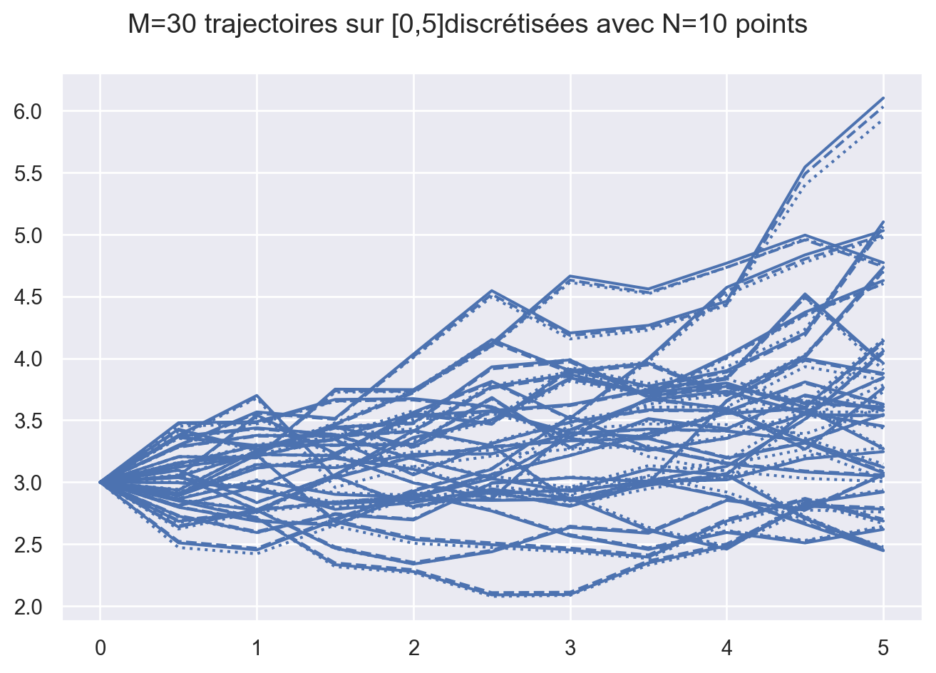 On définit la méthode recursive_simulation de la classe ornstein_uhlenbeck qui implémente la simulation des trajectoires en utilisant une boucle for pour construire itérativement \(X_{t_{k+1}}\) à partir de \(X_{t_k}\) (les \(M\) trajectoires en même temps).