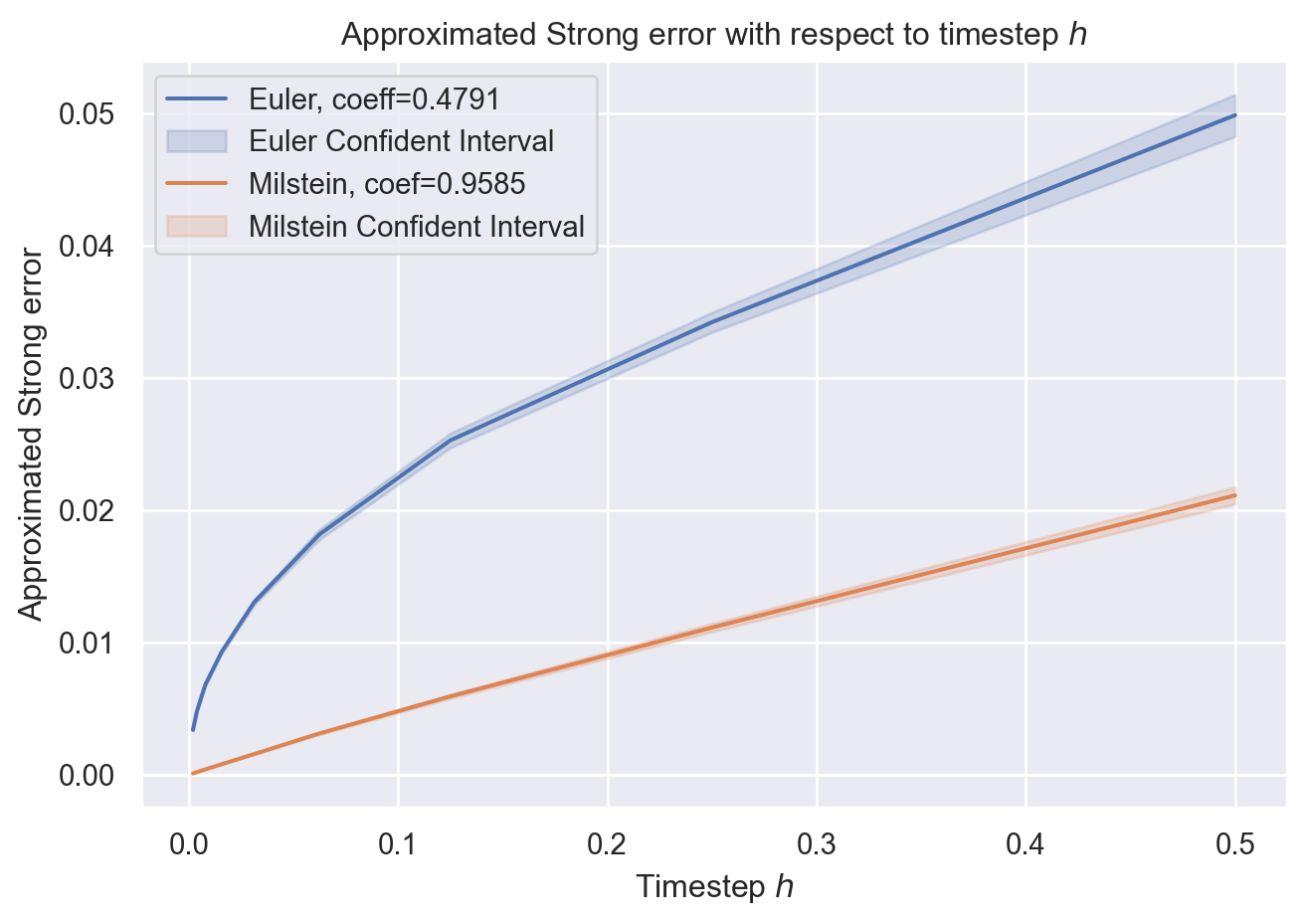 On peut vérifier les coefficients \(\alpha = 1/2\) pour Euler et \(\alpha = 1\) pour Milstein en faisant une régression linéaire en échelle logarithmique. Par exemple en utilisant scikit-learn cela donne