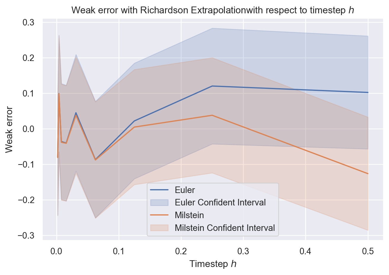 L’extrapolation de Richardson est une technique simple, très utilisé en analyse numérique, permettant de gagner un ordre de convergence. En effet, en considérant une combinaison linéaire entre un schéma de pas \(\frac{T}{N}\) et un autre de pas \(\frac{T}{2N}\) on peut améliorer l’ordre de convergence en éliminant le premier terme \(\frac{c_1}{N}\) qui apparait dans le développement de l’erreur faible: \[