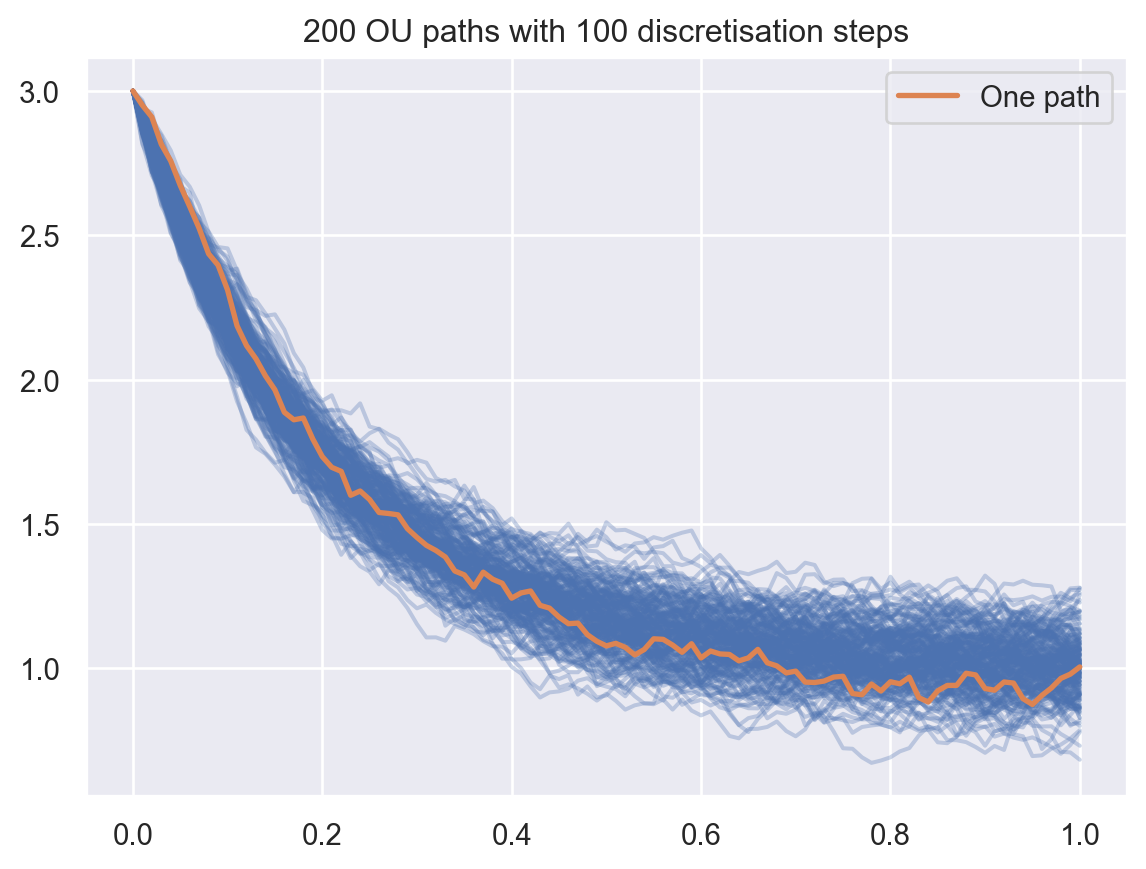 ou = ornstein_uhlenbeck(lambd=5, mu=1, sigma=0.3)print(ou)x0, T =3.0, 1print(f"Point initial x0 = {x0} et temps terminal T = {T}")mean_T = ou.mu + (x0-ou.mu) * math.exp(-ou.lambd*T)var_T = ou.sigma**2/ (2*ou.lambd) * (1- math.exp(-2*ou.lambd*T))print(f"mean: {mean_T}\t var: {var_T}")